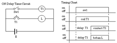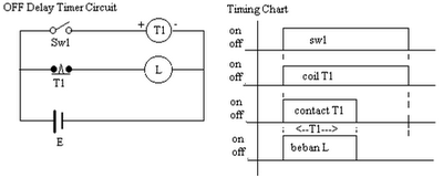 Di atas contoh OFF Delay timer, jadi saat coil energize, contact langsung ON samapi waktu tertentu (T1) kemudian OFF.