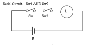 Seri, dikenal juga dengan rangkaian dengan kombinasi AND, dimana state/kondisi ON dan ON (1), maka lampu akan menyala.