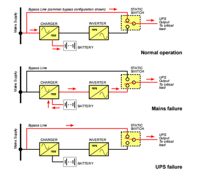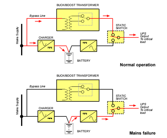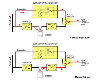 UPS jenis ini merupakan UPS paling murah diantara jenis UPS yang lain. Karena rectifier dan inverter berada dalam satu unit. Dalam keadaan gangguan, switch akan berpindah sehingga suplai daya dari suplai utama terblok. Akibatnya akan mengalir arus DC dari baterai menuju inverter.