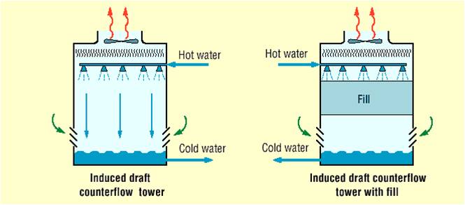 Fungsi Cooling Tower adalah sebagai alat untuk mendinginkan air panas dari kondensor dengan cara dikontakkan langsung dengan udara secara konveksi paksa menggunakan fan/kipas. Berikut gambar Cooling tower dengan sistem kerjanya: