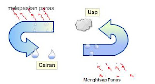 Sebelum jauh ke AC, sebaiknya mengenal prinsip pendinginan terlebih dahulu. Mungkin pernah kita menempelkan kain dengan alkohol ke kulit kita. Apa yang terjadi? kulit akan merasa dingin, karena alkohol menyerap panas dari udara sekitar, sehingga terjadi perubahan bentuk dari alkohol cair menjadi gas, seperti ilustrasi di bawah ini: