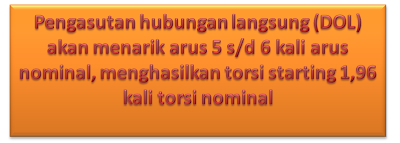 Motor di starting pada tegangan nominal, akan mengalir arus mendekati arus hubung singkat = 7 In. jika slip = 4% = 0,04, maka besrnya torsi Besarnya torsi starting = 1,96 kali torsi nominalnya. Kesimpulannya, saat arus starting 5 s/d 6 kali arus nominal hanya menghasilkan 1,96 x Torsi nominalnya.
